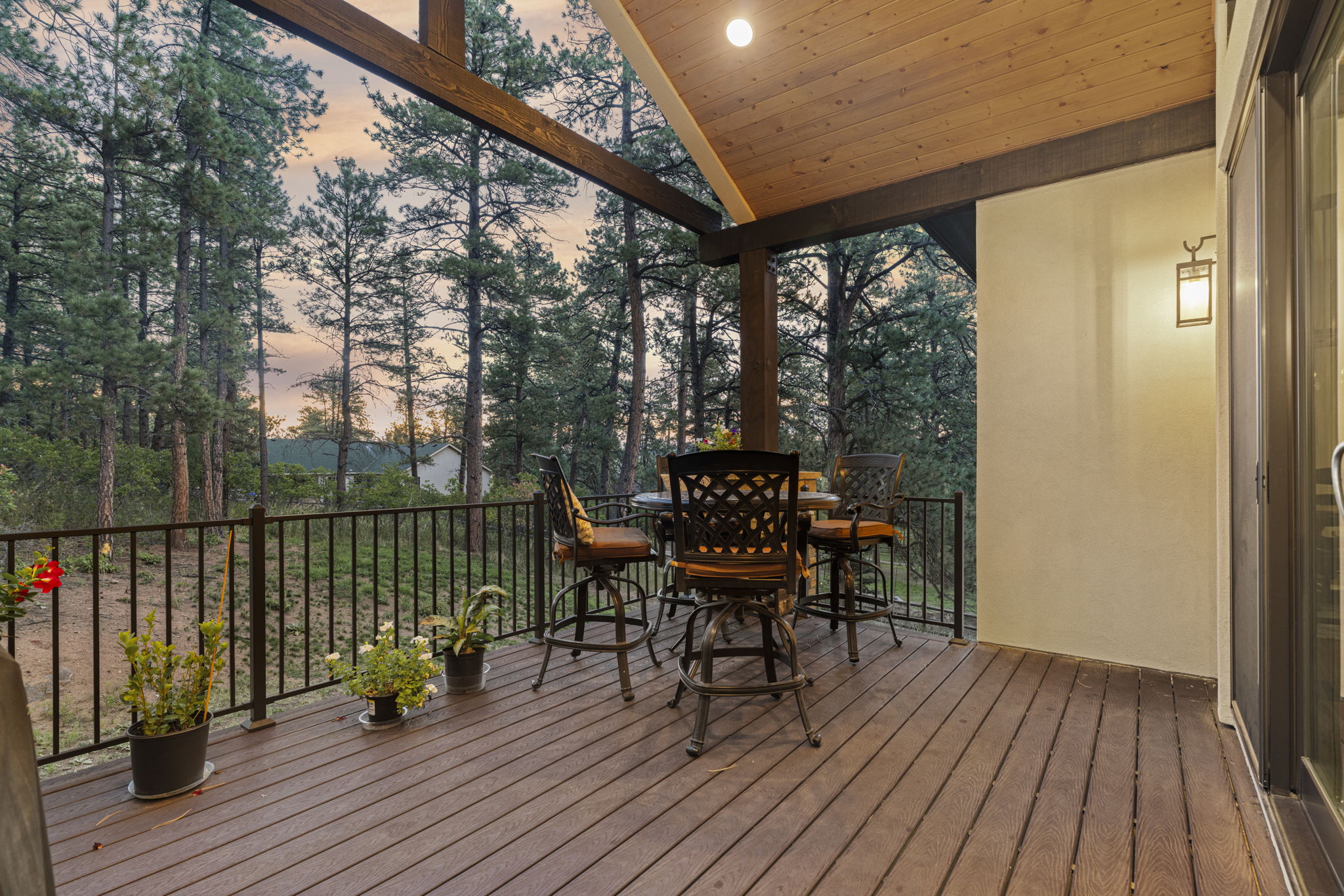 Welcome to this immaculate, nearly new custom ranch-style home nestled in the red rock hills of Perry Park—where luxury, design, and serenity collide. This 5-bedroom, 4-bathroom masterpiece (plus main floor study) boasts a double front door entry and stunning hardwood floors throughout the open-concept layout. The gourmet kitchen is a true showstopper, featuring 42" warm ivory cabinets, a massive island with Brazilian quartzite counters, handcrafted walnut hood, a professional 6-burner gas cooktop with dual ovens, built-in refrigerator, walk-in pantry, and an elegant dining area—all flowing seamlessly into a dramatic family room with 14’ vaulted ceilings, custom beams, and a stacked-stone modern gas fireplace. The double sliding doors lead to a covered deck with plank ceiling, perfect for entertaining or soaking in the peaceful, wooded setting.