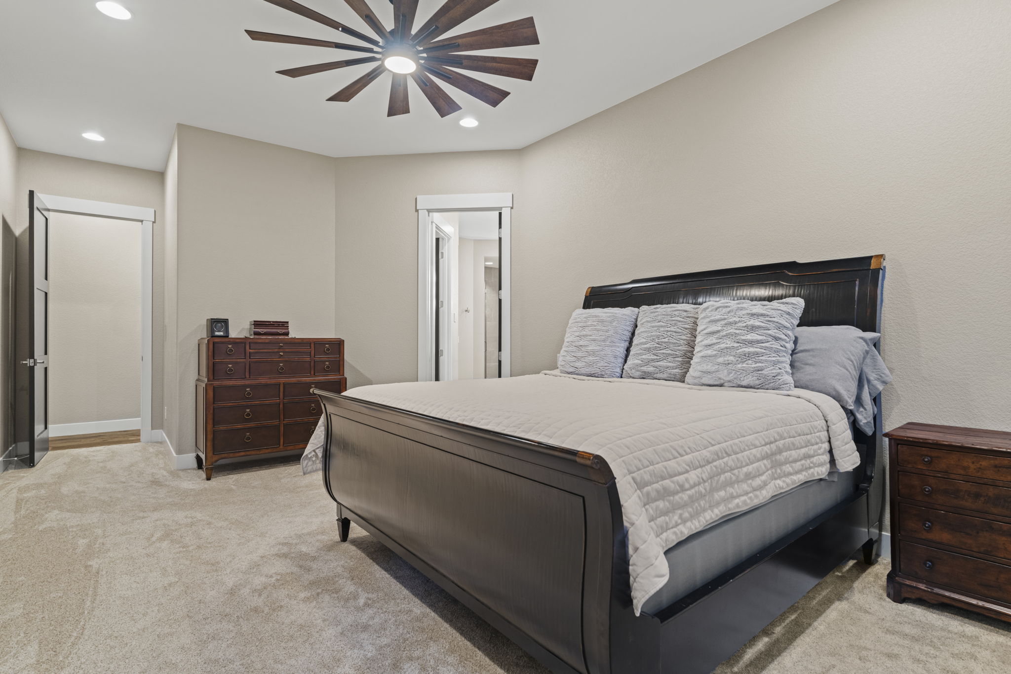 A tranquil retreat with patio access, spa bath, and custom walk-in closet connected to laundry.