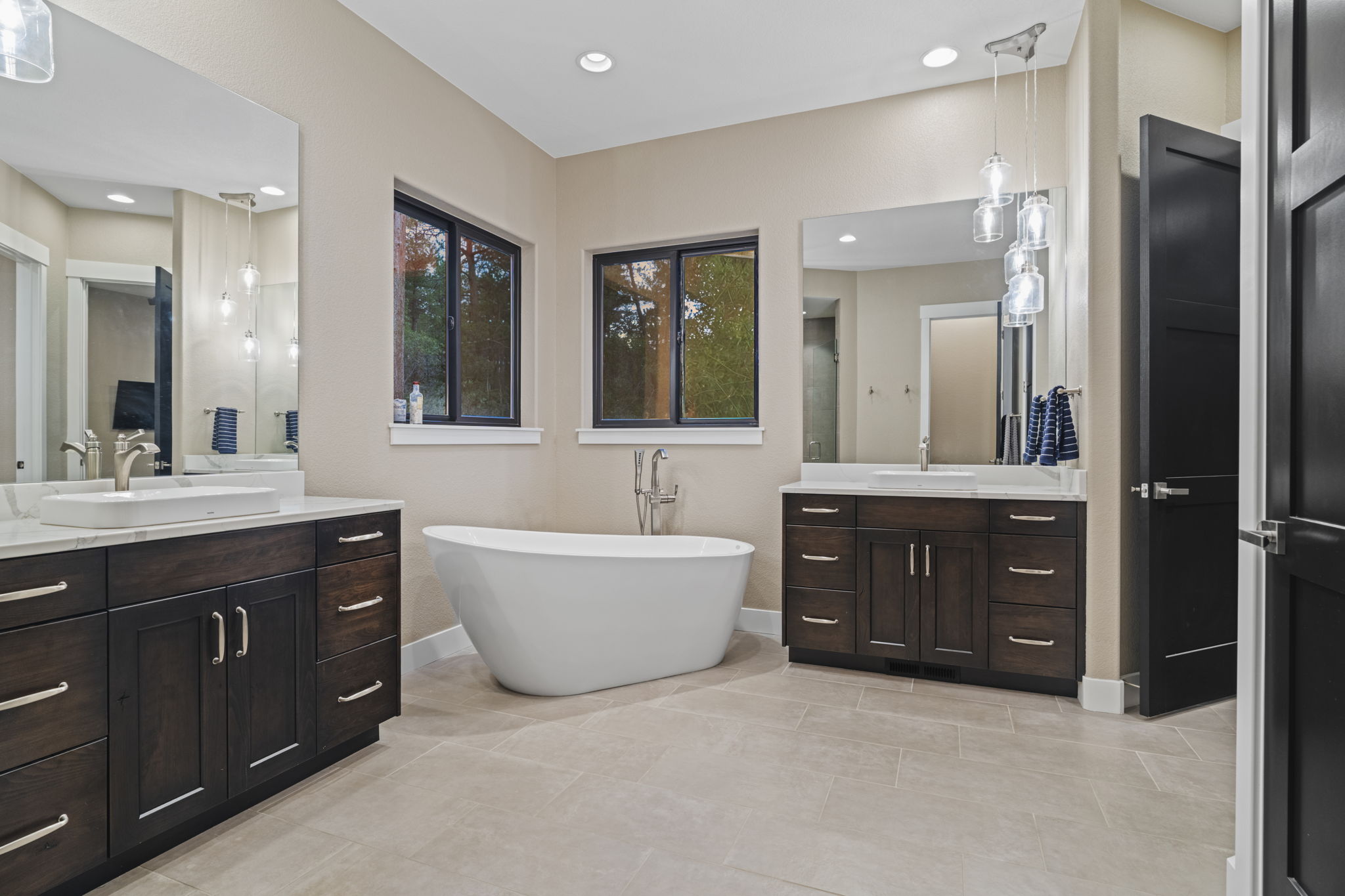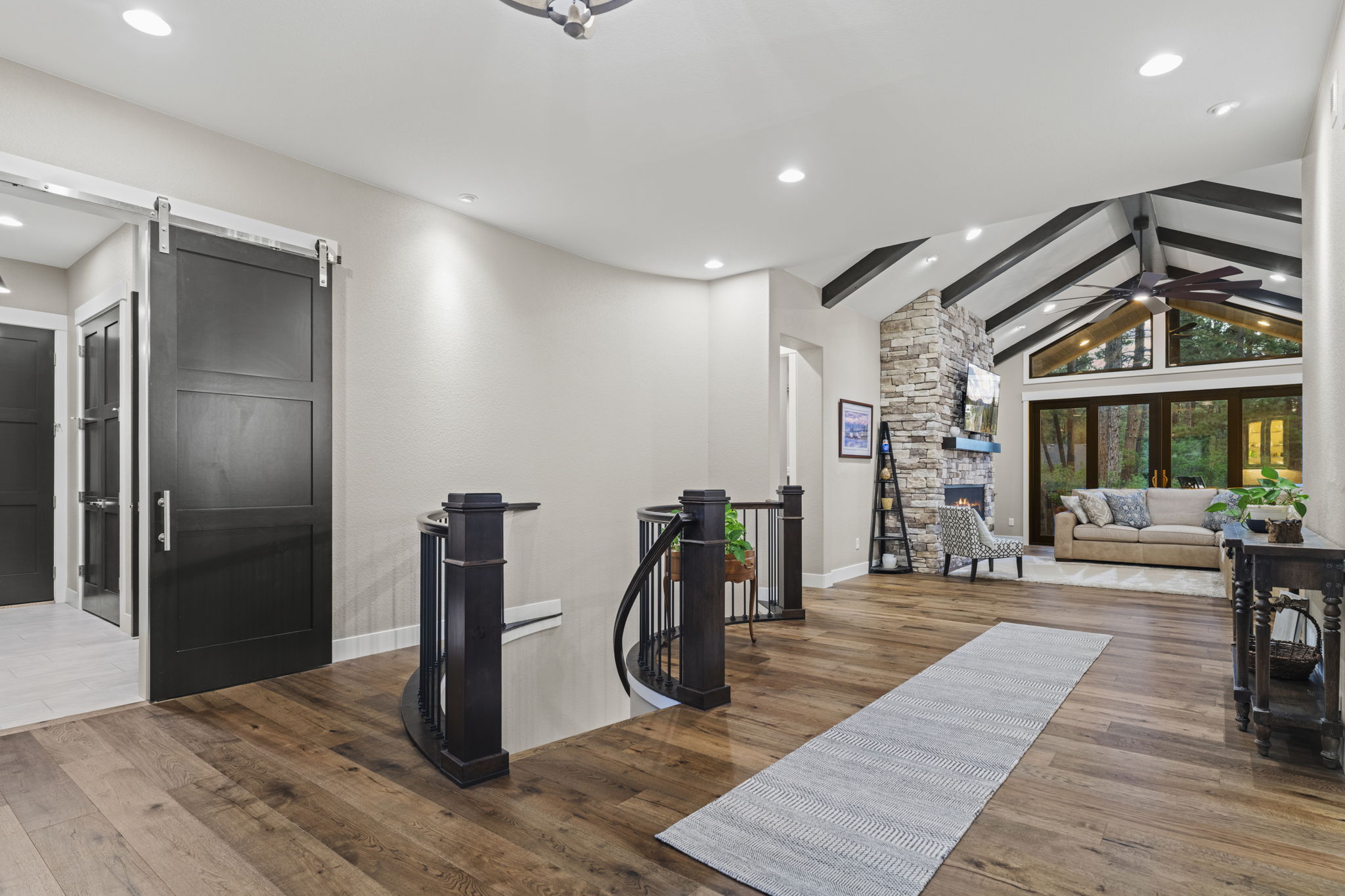 The main floor study features glass barn doors and is located next to a stylish powder bath with a reclaimed wood accent wall. The private primary suite includes patio access and a luxurious 5-piece bath with heated floors, a standalone soaking tub, dual shower heads, seamless glass, dual vanities, and a 10x14 walk-in closet with direct access to the laundry room (utility sink + upper cabinets). Two additional guest bedrooms share a beautifully appointed ¾ bath.